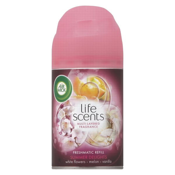 Remove odors and let the summery scent of this air freshener spray fill the environment with vanilla, melon and floral notes. This Air Wick Life Scents Freshmatic refill contains essential oils that refresh any area for up to 60 days.