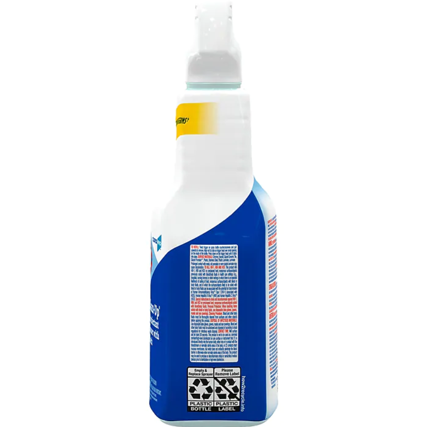 Usage Directions:It is a violation of Federal law to use this product in a manner inconsistent with its labeling. USE ONLY IN WELL VENTILATED AREAS. If vapors bother you, leave room while product is working. TO CLEAN AND DISINFECT HARD, NONPOROUS SURFACES: Spray product 4-6 inches from surface until thoroughly wet. Let stand 30 seconds or longer if noted. Wipe with a wet sponge or cloth and rinse with water. See product label for more information.Ingredients: Active ingredient: sodium hypochlorite 1.84%, other ingredients 98.16% (Yields 1.75% available chlorine).