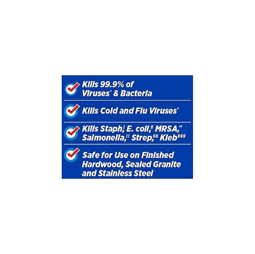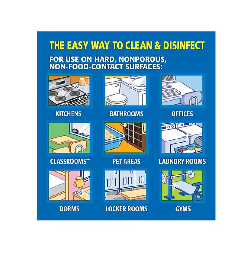 - Germs and messes occur on more than kitchen counters and bathroom surfaces – safely wipe down desks, remotes, or clean up spills