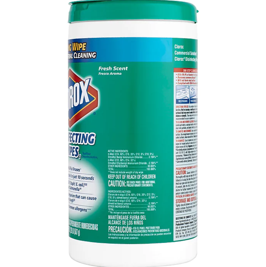 Clorox Disinfecting Wipes clean and disinfect in one easy step. These sanitizing wipes are EPA-registered to kill 99.9% of germs including cold and flu viruses, E. coli, Salmonella, Staph, Strep, MRSA and the organism that can cause whooping cough. They also remove common allergens like pet dander, pollen particles and grass. One antibacterial wipe can kill bacteria in just 10 seconds, which is three times faster than before. The premoistened, thick, texture wipes are perfect for spills and dirt on a variety of hard, nonporous surfaces including acrylic, glass and vinyl. They quickly clean and disinfect high-touch germ hot spots such as doorknobs, handrails and faucets and are suitable for use on phones, keyboards and mouse. Ideal for offices, day care centers, schools, hotels, restaurants and other commercial facilities. Packaging may vary.