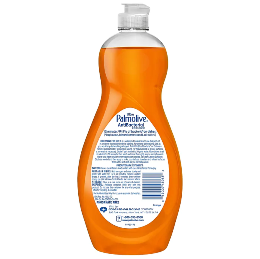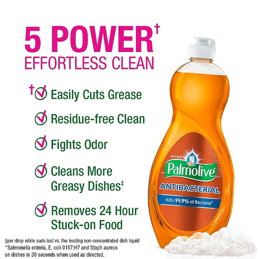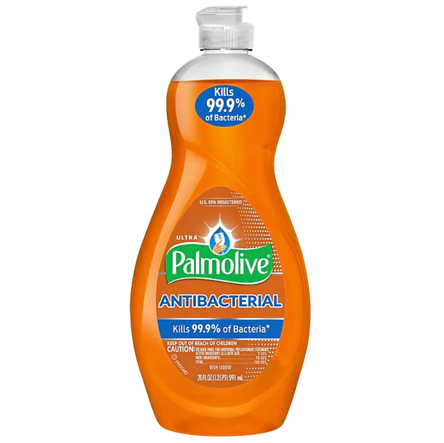 Wash eating utensils, glasses, and dishes with this liquid detergent. It kills 99.9 percent of E. coli, salmonella, and staph for safe food surfaces, and the fresh orange scent is appealing, so washing dishes is a pleasant experience. This Palmolive dish liquid has a grease-cleaning agent that disintegrates oils for less rinsing.