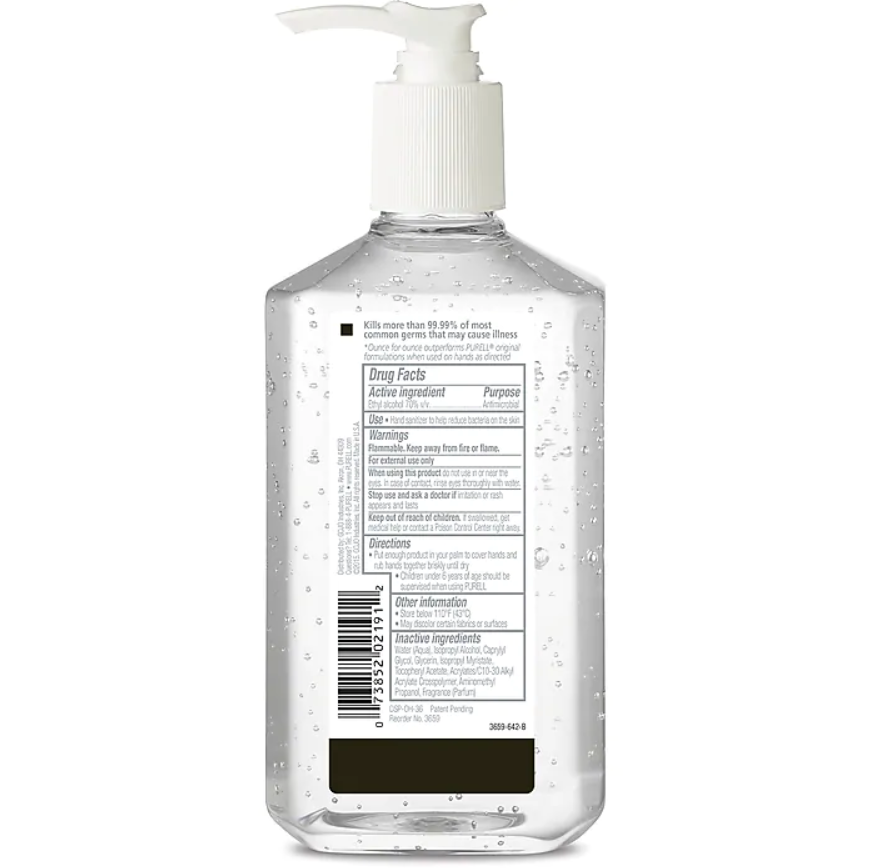 • PURELL® hand sanitizer gel bottle provides protection against germs while keeping hands soft even after many uses
