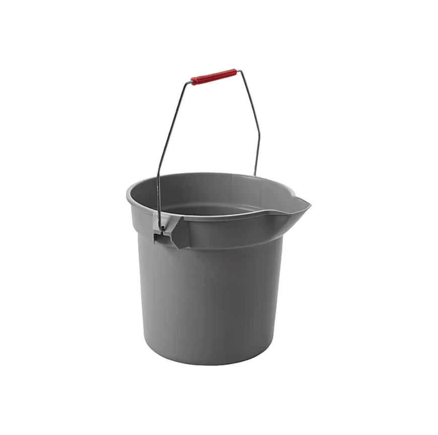 Combine cleaning concentrate with water easily in this gray 10-quart bucket. The walls are constructed from heavy-duty plastic for extra sturdiness, and the molded-in spout allows for easy pouring. This Rubbermaid bucket has a handy metal carry handle for transport.