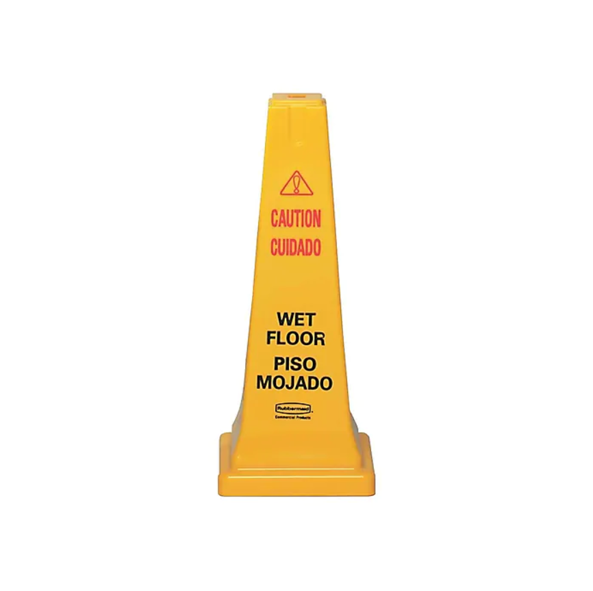Alert staff and customers to slick flooring conditions with this Rubbermaid Commercial four-sided safety cone. Multilingual messaging and universal symbols ensure all your building’s visitors understand the message, and the bright yellow color makes this sign easy to notice. Featuring a unique top cutout, this Rubbermaid four-sided safety cone accommodates lock-in sign holders, safety lights and barricade belts for a variety of customization options.